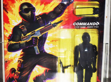 Snake Eyes is the code name of a member of the G.I. Joe team. Much of his history and information, including his real name, place of birth, as well as almost everything else about him, have remained classified throughout all depictions of his origin. All that is known for certain about his military standing is that he holds the rank of U.S. Army Master Sergeant (E-8), has undergone Drill Sergeant training, and is a former U.S. Army Special Forces Delta Operator. He is also the team's resident hand to hand combat instructor. Very little else about his past has been revealed. He was originally billed by Hasbro Toys in 1982 as a Commando, but by 1984, in the pages of Marvel Comics, it became clear that he was also a full-fledged ninja master.